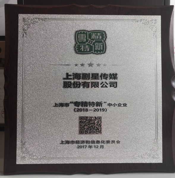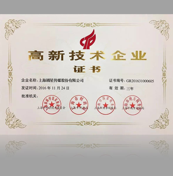 上海剧星传媒股份有限公司获上海市科学技术委员会、上海市财政局、上海市国家税务局、上海市地方税务局联合颁发的“高新技术企业”认定证书。