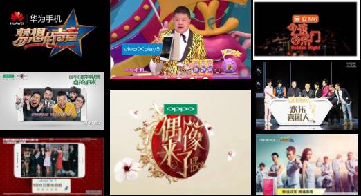 4.手机品牌广告异军突起,包揽大型季播节目冠名。vivo、OPPO、小米、华为、金立等手机品牌借助版权综艺或纯网综艺进行娱乐营销,尝试契合自身品牌传播的高效、醒目的植入与花式广告方式,将产品与节目有效充分融合,抢占品牌娱乐内容营销制高点。