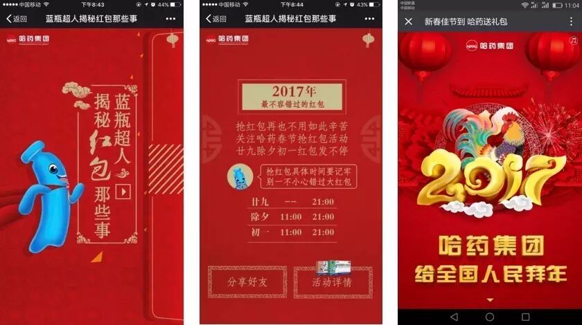 2017年春节期间,剧星传媒北京分公司为哈药集团打造了一个哈药春节大拜年&抢红包活动,广告总曝光量达到24.66亿次,红包抽奖页面被打开1.48亿次,有将近9000万人参与了活动,许多用户还会主动分享活动并发声,用户参与度和体验度反馈非常好, 这是活动的一大亮点。